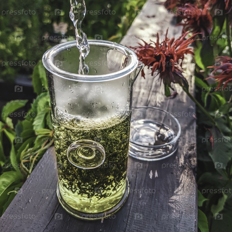 Спокойный и спокойный момент, когда вы наливаете освежающий зеленый травяной напиток в окружении яркого пышного зелени