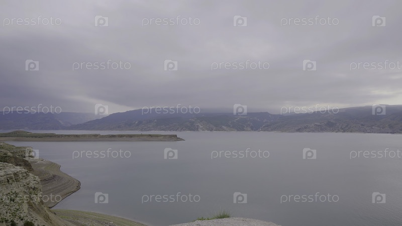 Прекрасное озеро в горах. Идите дальше. Вид на живописное озеро на фоне гор в пасмурную погоду. Спокойное озеро в горах против облачного неба