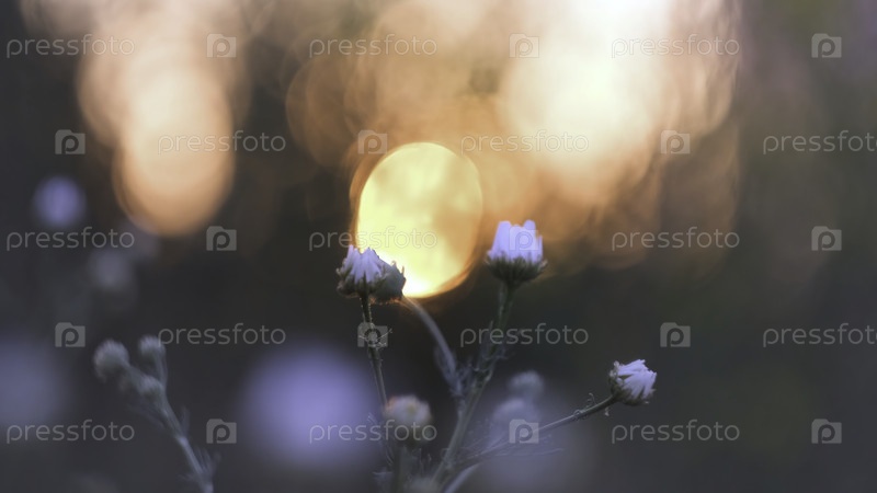 Близкий план диких цветов на размытом фоне с боке. Концепция. Нежно закрытые пузырьки дикорастущих цветов среди расплывчатых ламп