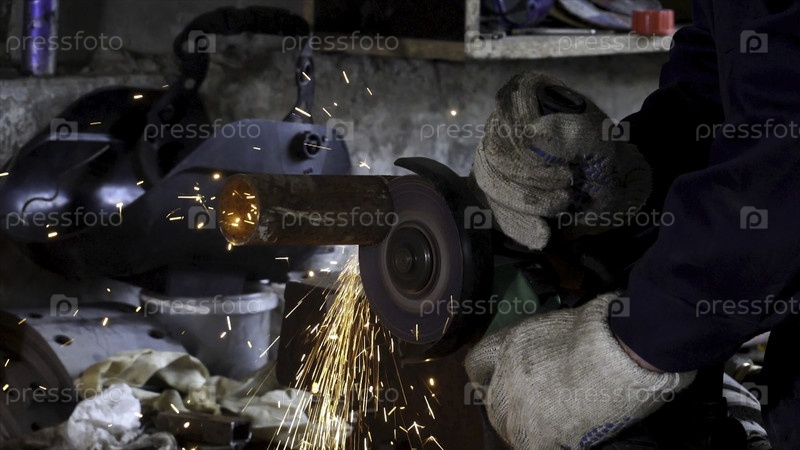 Рука мужчины отрезает кусочки водопроводной трубы с помощью угловой шлифовки.Обрезка превратилась в брызгу искр на стройплощадке.Искры при резе металлической угловой шлифовки