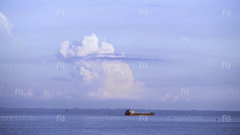 Грузовой контейнерный корабль, плавающий в по-прежнему замерзшем летном море на голубом облачном фоне.Стреляния.Красная баржа, плывущая в синем море против горизонта