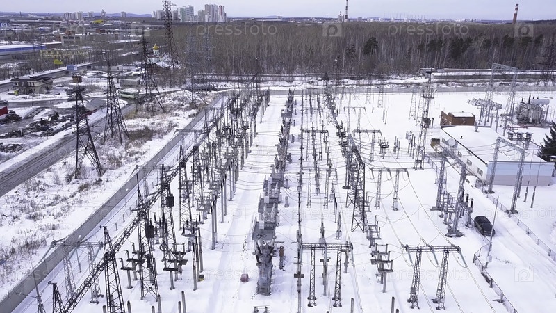 Серия электрических столбов подстанции. Продолжайте. Вид на небольшую электрическую подстанцию с рядом трансформаторов в пригороде. Подвижная электростанция зимой