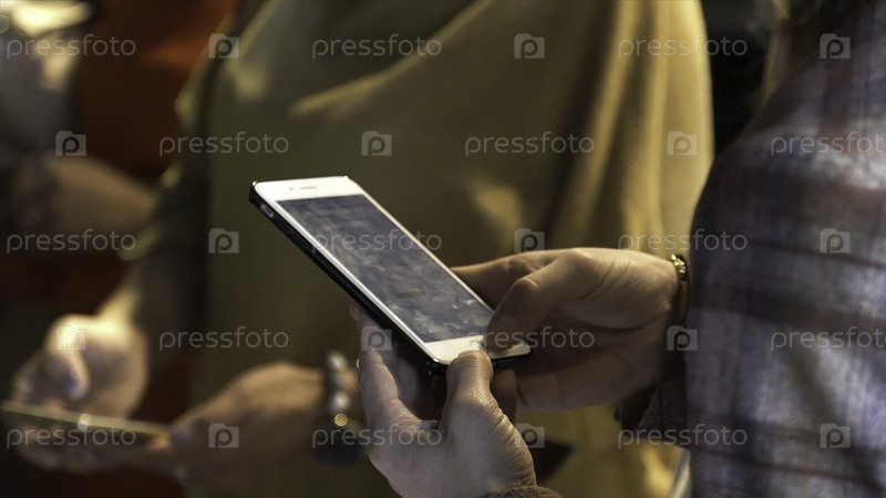 Закройте руки с помощью смартфона, поднимите уровень яркости до максимума и отдайте его другому человеку Сцена. Мужчина повышает уровень яркости сотового телефона до верхнего предела и показывает это другу