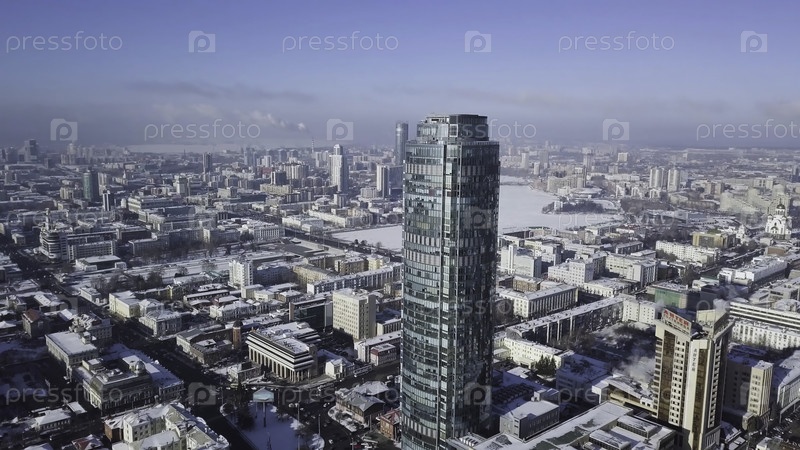 Вид с воздуха на небоскреб расположен в центре города зимой, голубое небо и снежные крыши фоновых зданий