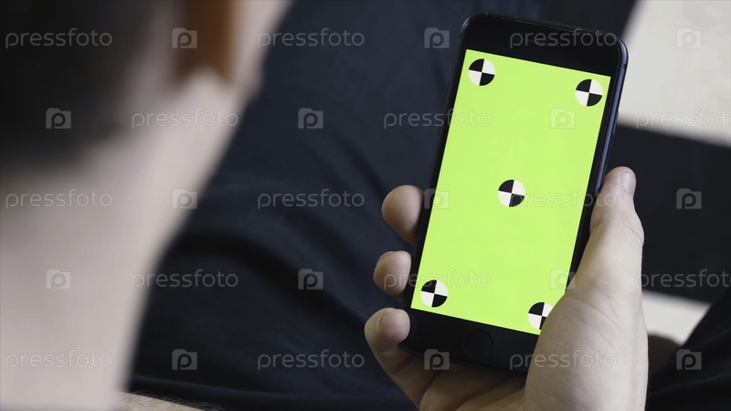 Вид на плечо мужчины в черной рубашке и джинсах, использующего смартфон с зеленым экраном. резервные записи. Chromium key green screen