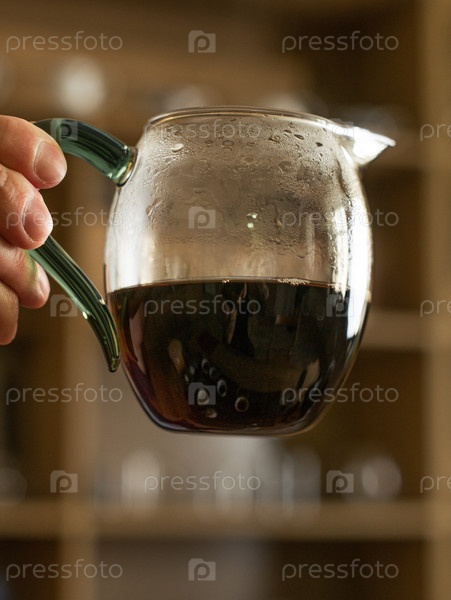 Покрывая руку, держащую стеклянный кружок богатого темного кофе, демонстрируя пар и его яркий цвет