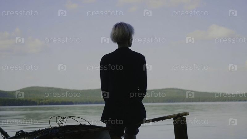 Девушка с светлыми волосами сидит на пирсе озера