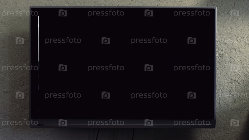 Экран телевизора на стене. Телеведущий прислонился к стенке с пустым экраном телевидения. ЖК-экран или светодиодный телевизионный экран, висящий на стене с вырезанным треком