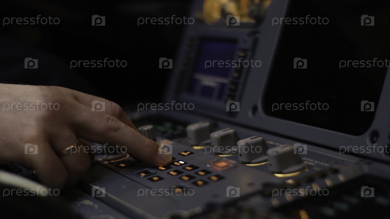 Элемент управления автопилотом лайнера. Переключательная панель на пилотской палубе самолета. рычаги двухмоторного авиалайнера. Пилот управляет самолётом. Бортовый компьютер, кабина