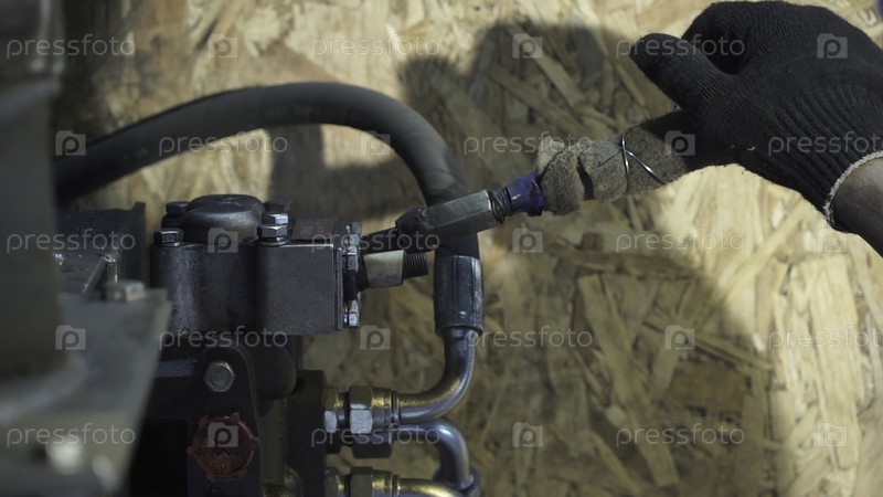Работник фабрики переключает рычаги на больших машинах в мастерской