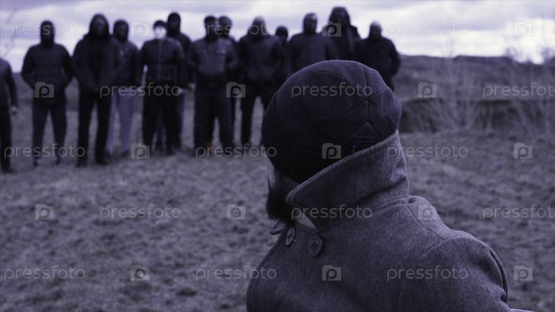 Мужчина сидит в кресле и смотрит на группу маскированных преступников