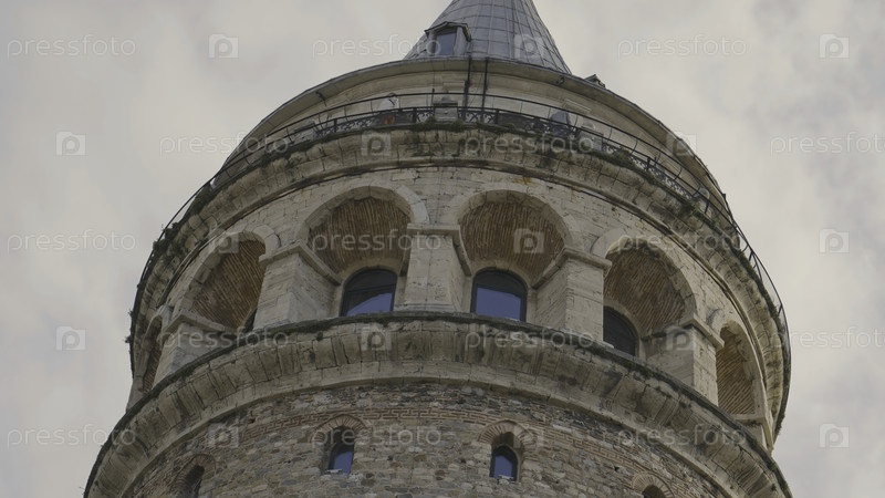 Нижний вид на башню Галата. Идите вперед. Древняя каменная башня против голубого неба. Историческая каменная башня в центре Стамбула. Архитектурные достопримечательности Стамбула