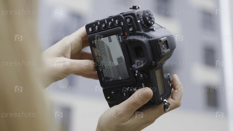 Закрытие экрана женской и профессиональной камер. Продолжайте. Женская фотограф снимает жилые здания с помощью профессиональной камеры. Экран камеры во время уличной съемки
