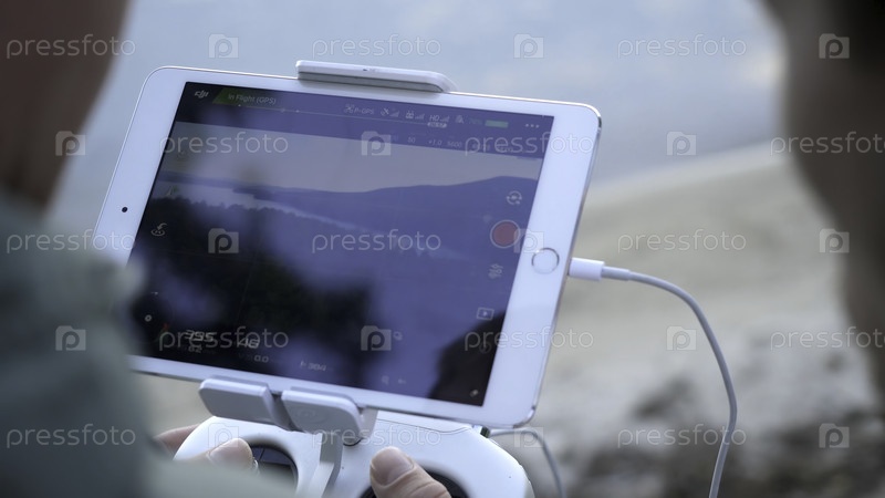 Руки человека с дистанционным управлением летают на маленьком квадрокоптере игрушки в природе