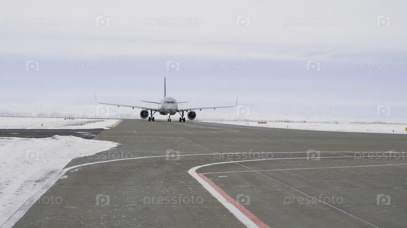 Самолет находится на взлетно-посадочной полосе. резервные кадры. самолёт готовится к взлету, двигаясь вдоль взлетно-посадочной полосы зимой. самолёт на взлётной полосе перед полетом за границу для отдыха