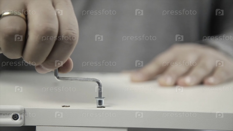 Инструменты для сборки мебели. Сток. При сборе мебели руки в перчатках покрывают плотный винт на мебель. Монтаж и сборка мебели, использование крепежных элементов, деревянный винт для прокрутки соединения