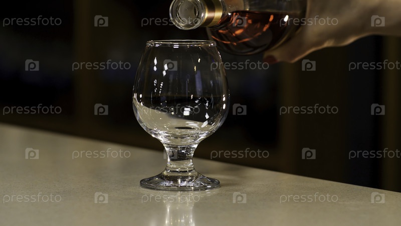 Закройте руку женщины, наливающей коньяк в стакан, стоящий на стойке бара. Резервные кадры. Рука заливает алкоголь в стакан на размытом фоне темной комнаты