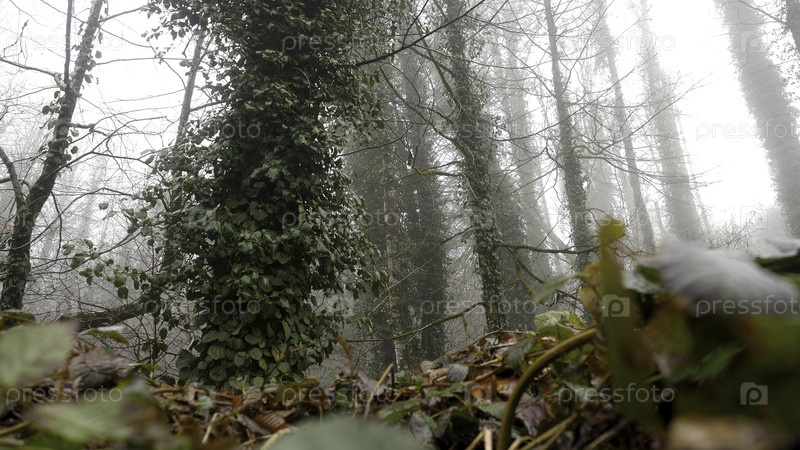 Красивый ствол дерева покрыт зеленым плюшем в туманном лесу, вид снизу. резервные кадры. Таинственная роща осенью, высохшая влажная трава на фоне облачного неба