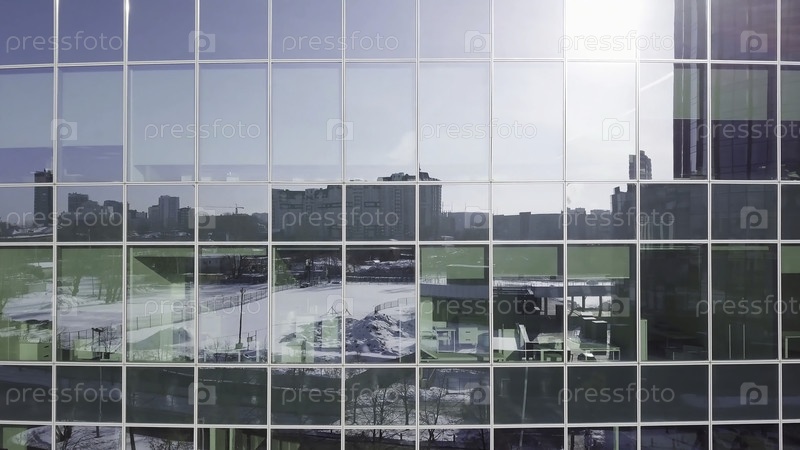 Фондовое окно офисного здания. Здания, отраженные в окнах современного офисного здания. Окна зданий, отражающие вид на город