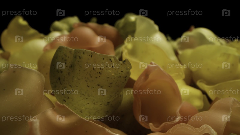 Закройте сухую оболочку контиглиони в виде пасты разных цветов. Резервные кадры. Необработанная макарона выделена на черном фоне, концепция традиционной итальянской еды