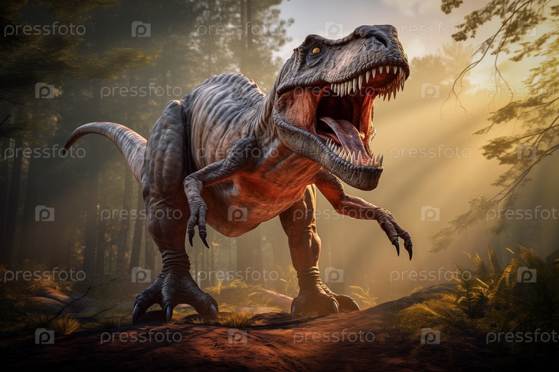 Тираннозавр Рекс рычит в доисторическом лесу с пышной растительностью, папоротниками и солнечным светом