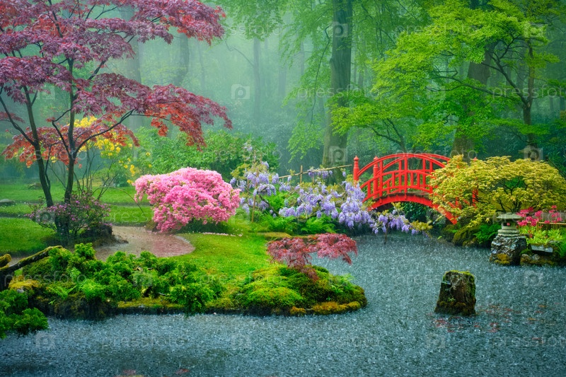 Небольшой мост в японском саду под дождем, парк Клингендейл, Гаага, Нидерланды