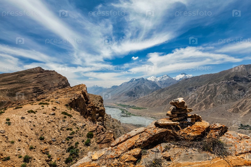 Вид на Гималайскую долину Спити с каменным пещером. Долина Спити, Химачал-Прадеш, Индия