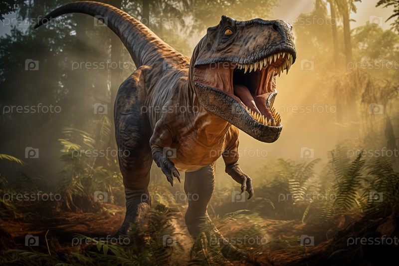 Тираннозавр Рекс рычит в доисторическом лесу с пышной растительностью, папоротниками и солнечным светом