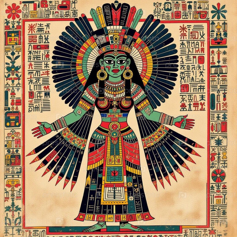 Красочная иллюстрация ацтекской пернатой богини с продуманным платьем, головным убором и иероглифной границей