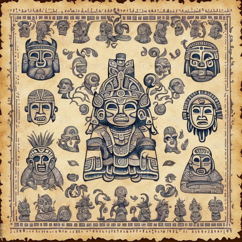 Ацтекские боги с древним мезоамериканским орнаментом на старой бумаге