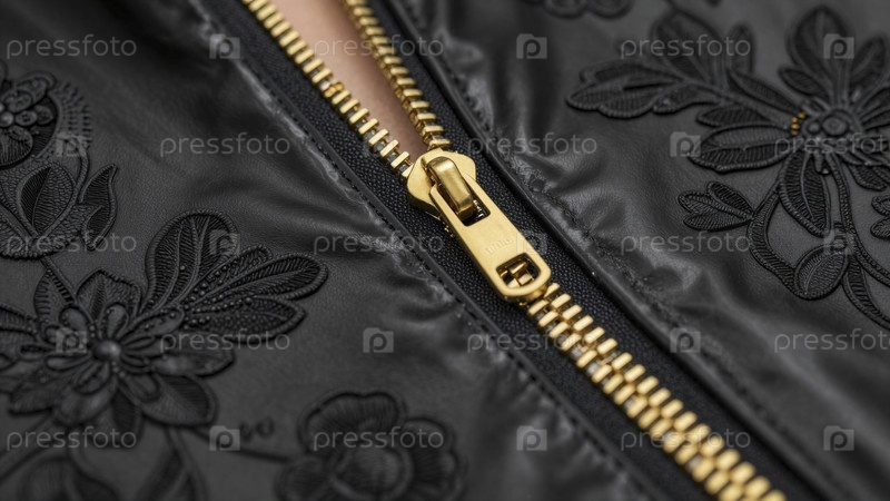 Золотая молния на черном кожаном куртке с цветочной вышивкой