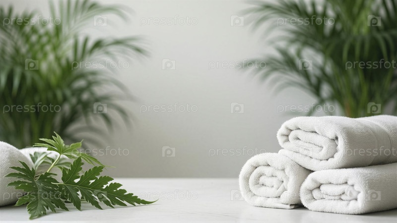 Спа- полотенца и зеленые листья на мраморном столе