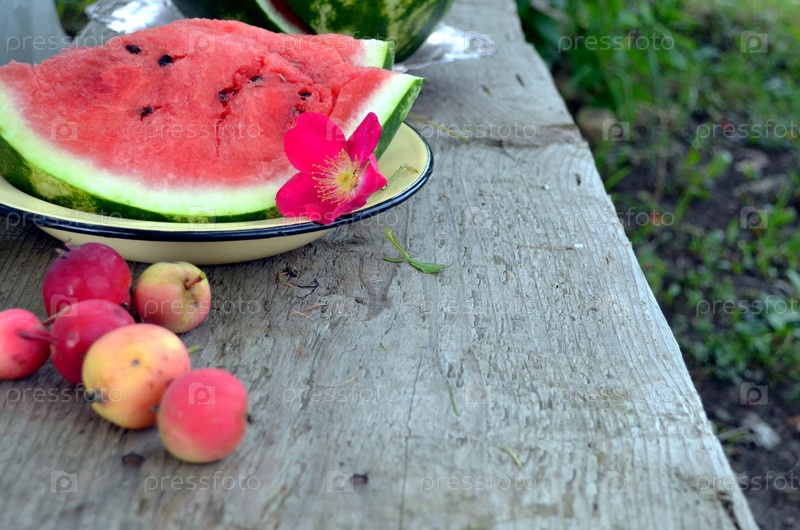 Вырезать арбуз в саду на скамейке