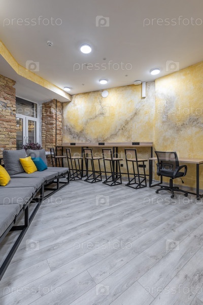 Просторный общественный хостел с модульным диваном, барной стойкой и коворкинг-пространством
