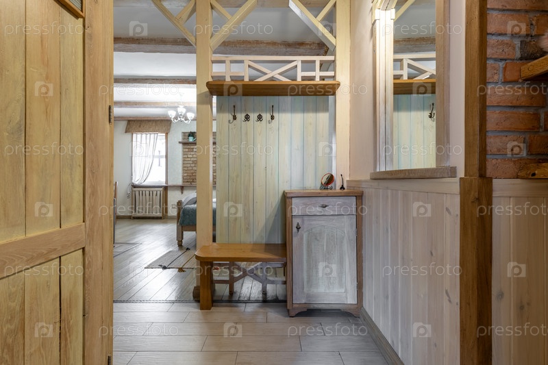 Внутренний вид из коридора деревни с деревянной стойкой для пальто и зеркалом, смотрящий на яркую гостиную с кроватью и естественным светом в деревянном доме
