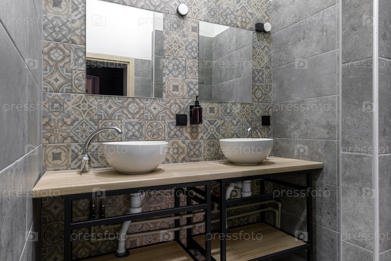 Внутренний вид общей ванной комнаты с двумя белыми керамическими раковинами на деревянном столешнице с черным металлическим каркасом.Стена украшена серой текстурированной плитой и декоративными рисунковыми плитками за двумя квадратными зеркалами