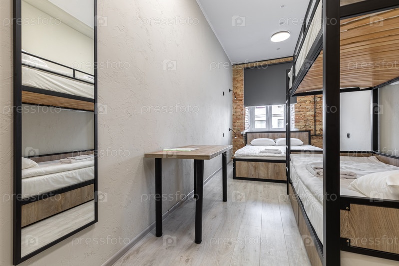 Внутренний вид современной комнаты общежития с черными и металлическими многоэтажными кроватьми с деревянными панелями и белыми постельными принадлежностями.Пространство включает высокое стеновое зеркало, отражающее кровати, простой деревянный стол и откр