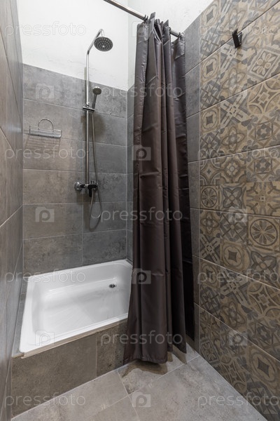 Внутренний вид чистой душевой зоны в общей ванной комнате.Пространство имеет серо-каменные плитки на стенах, декоративную акцентную стену с черепицей, хромированную систему душа и темно-серую завесу для душа