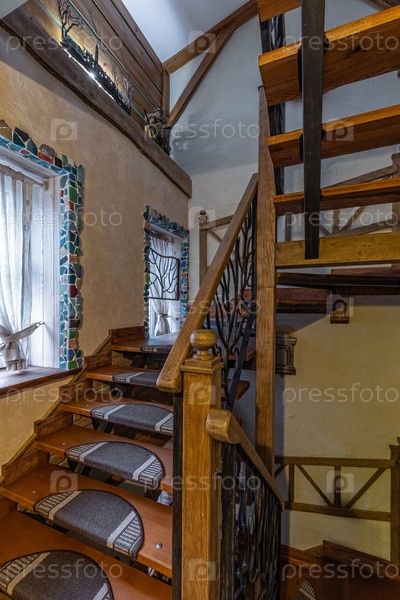 Уникальная деревенская лестница с металлическими перилами в стиле ветки и мозаиками