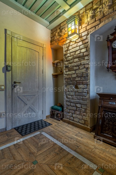 Атмосферный вечерний вид на коридор в стиле фермерского дома с деревянной дверью, открытым кирпичом с винтажным фонарем, античной мебелью и декоративными напольными плитками