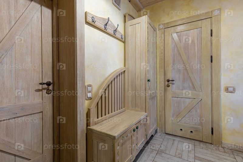 Теплый вход с индивидуальными легкими деревянными дверями, декоративная скамейка с цветочной живописью и текстурированные желтые стены в доме в стиле фермерского дома