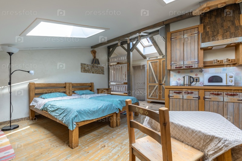 Открытый дизайн интерьера студии в деревянном доме с рустической кухней, двухместными кроватьми с синим бельем, столовой и яркими фонарями