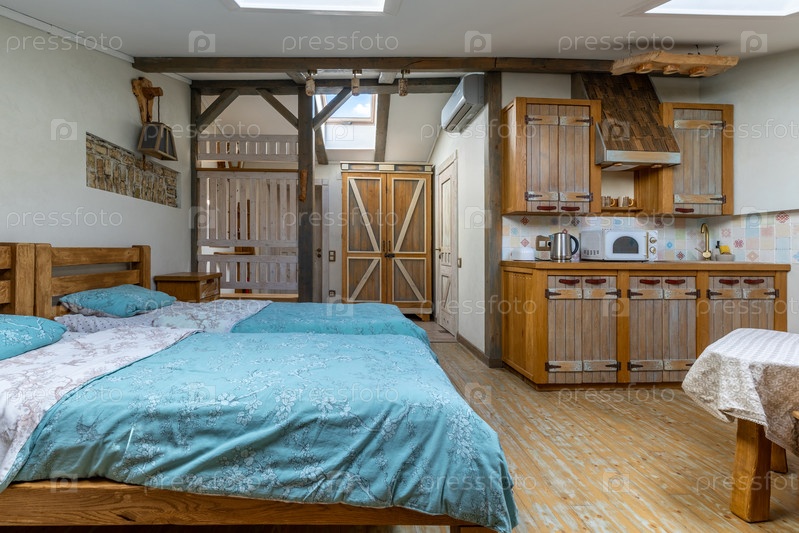 Яркая открытая квартира на чердаке в стиле фермерского дома с двумя кроватями с синим бельем, полностью оборудованная деревянной кухней и столовой под окнами
