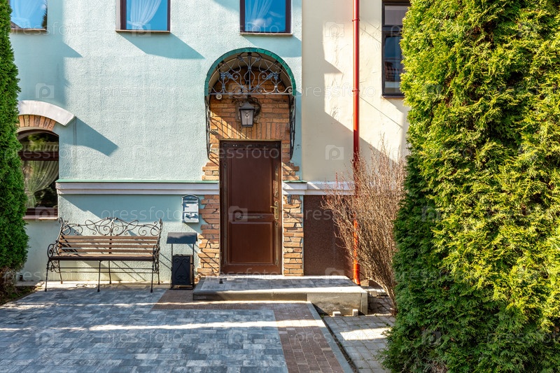 Исторический жилой вход с деревянными дверями, арочным навесом, декоративной металлической скамейкой и кирпичными деталями в старом городе Гродно