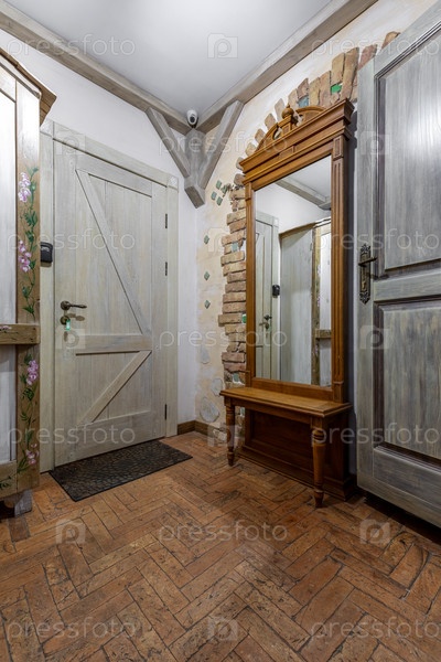 Уютный сельский коридор с деревянными дверями, винтажной зеркальной скамейкой, кирпичными акцентами на стенах и теплым текстурированным полом