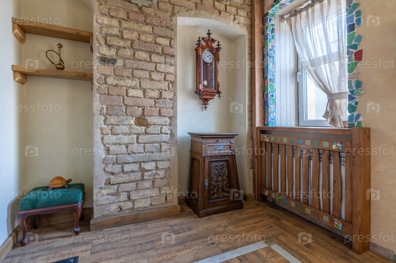 Красочный интерьер с винтажными настенными часами и деревянной мебелью