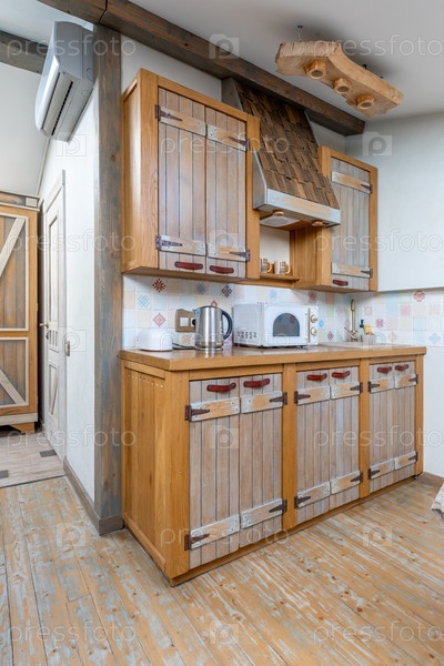 Красочный кухонный интерьер с деревянными шкафами ручной работы, винтажным оборудованием, натуральными текстурами и теплым освещением демонстрирует традиционное мастерство и уютный жилой дизайн