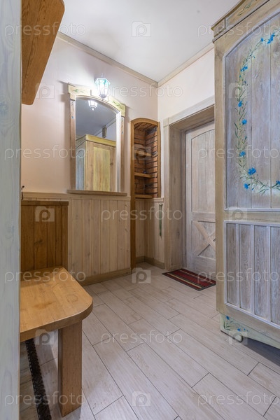 Вертикальный вид уютного вестибюля с легкой деревянной дверью, скамейкой со зеркалом и античным гардеробом, украшенным цветочными картинами в стиле фермерского дома