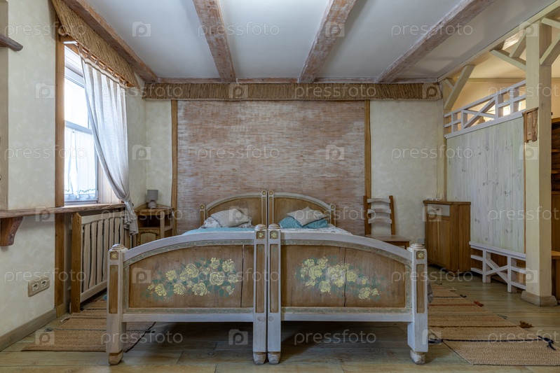 Фронтальный вид уютной спальни фермерского дома с винтажными деревянными кроватьми с цветочными декорациями, текстурированным деревянным стеновым декором и деревянными потолочными балки