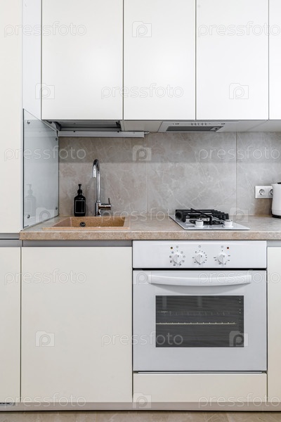 Чистый дизайн кухни с белыми шкафами, встроенной духовкой и газовой печью. она имеет бежевую каменную оболочку, хромированный кран и плитки в стиле серого мрамора. элегантное и функциональное пространство